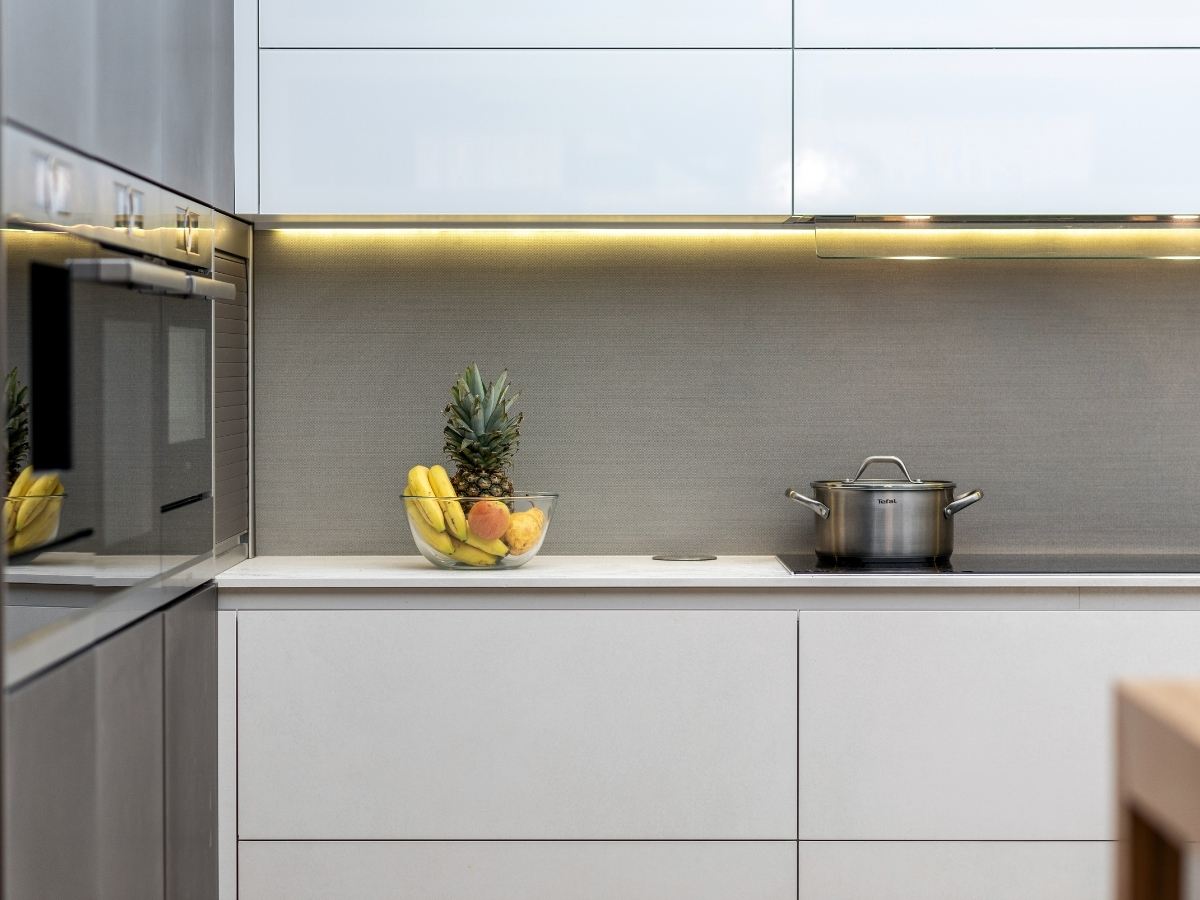 Magasfényű fehér konyhabútor – természetes munkalappal, elegáns részletekkel