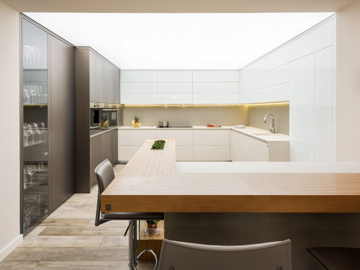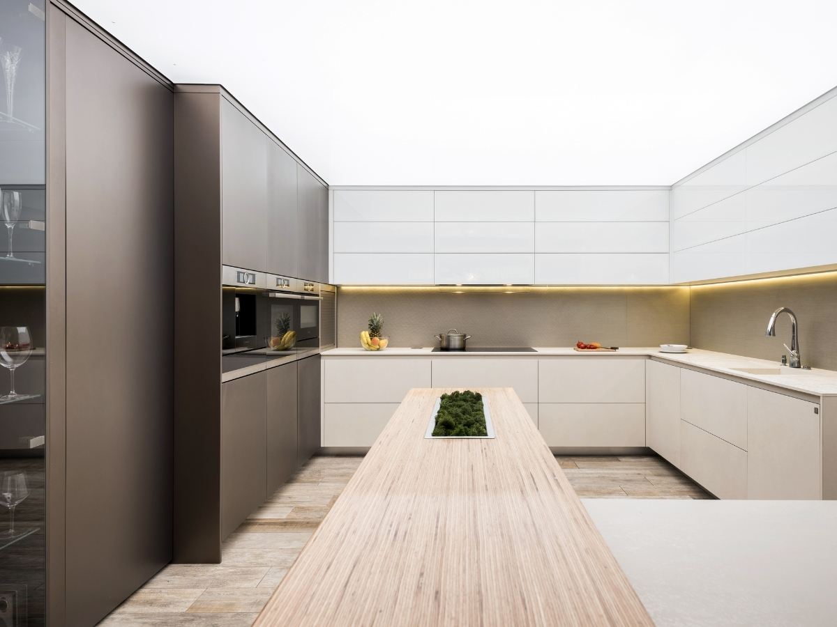 Ebben a letisztult konyhában a formavilág és a funkcionalitás tökéletes összhangban van. A magasfényű és matt felületek kontrasztja kifinomult térélményt teremt, miközben minden részletben megjelenik a prémium minőség.