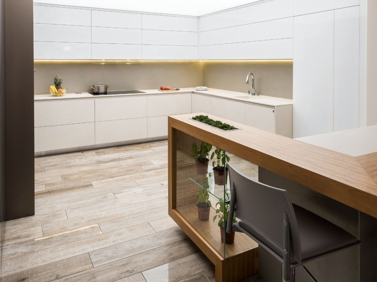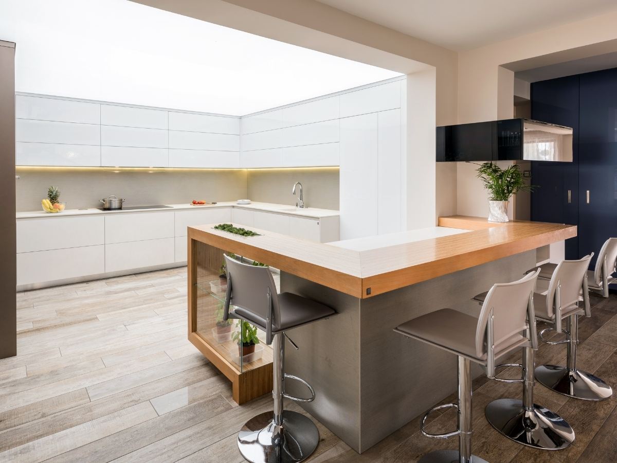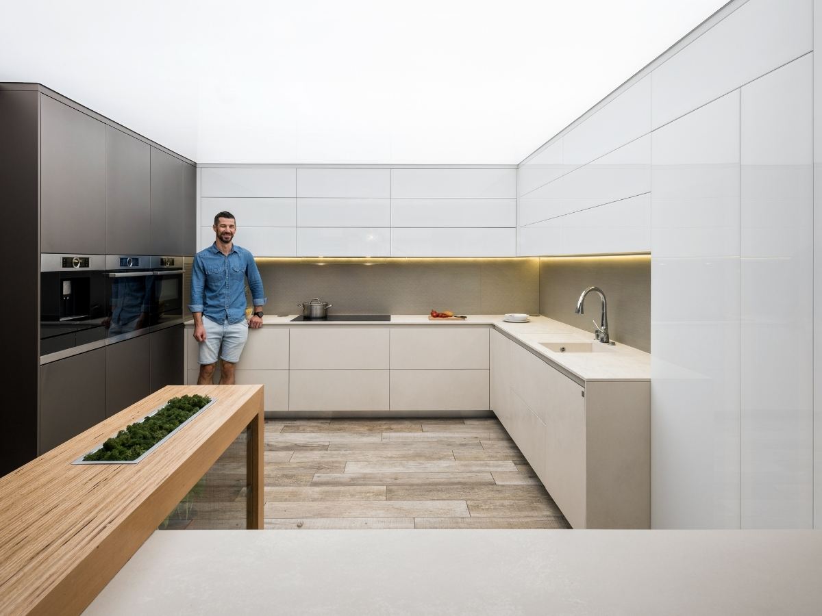 A beépített gépek síkba záródnak a bútorfronttal, a bútorlapok között rejtett tárolók és intelligens megoldások teszik gördülékennyé a mindennapi használatot. A furnér munkalap egyedi karaktert ad a konyhaszigetnek, a növények és üvegpolcok integrálása pedig meleg, otthonos hangulatot hoz a modern térbe.