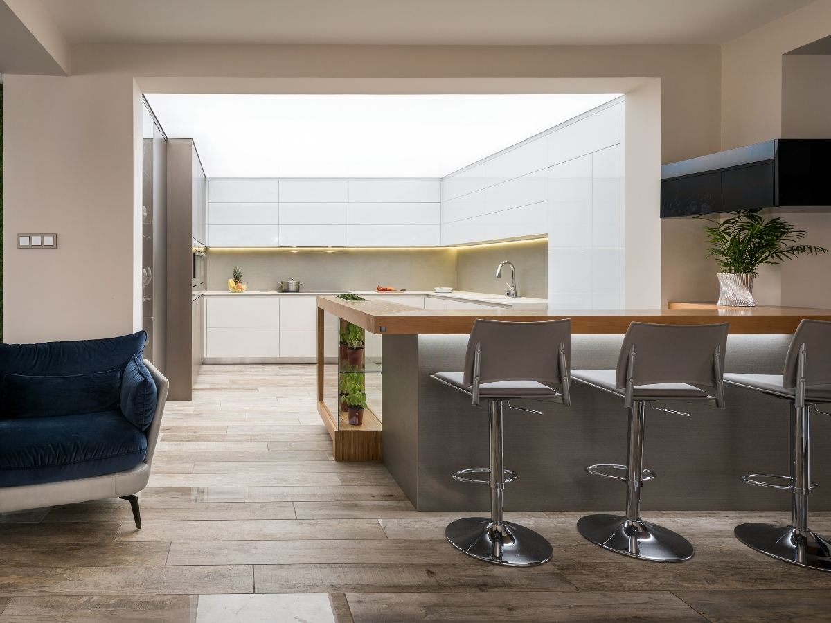 Ez a projekt azoknak szól, akik a fényes, minimalista stílust kedvelik, de nem akarnak lemondani a természetes hatású anyagokról és a kényelmes, jól szervezett belső terekről.